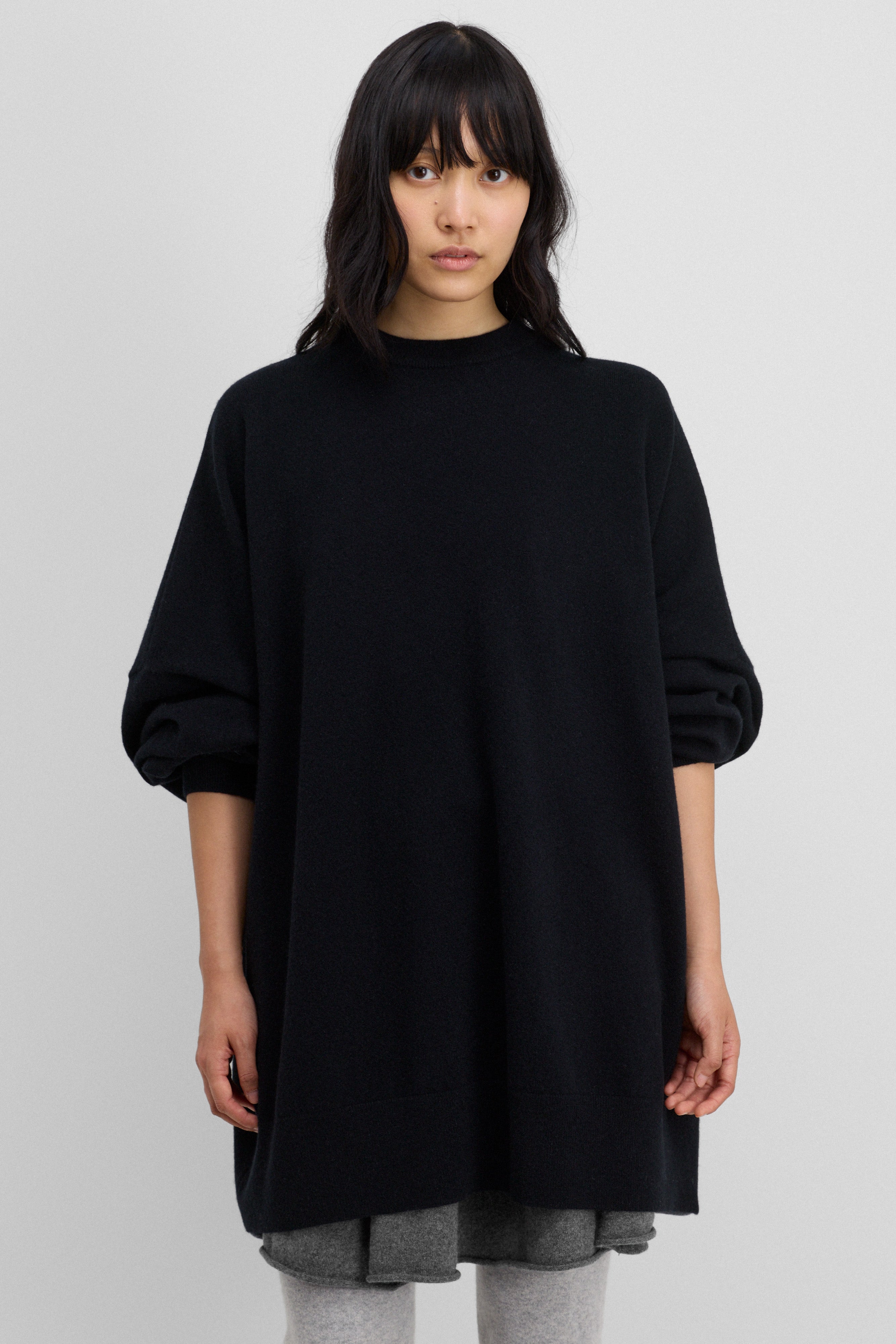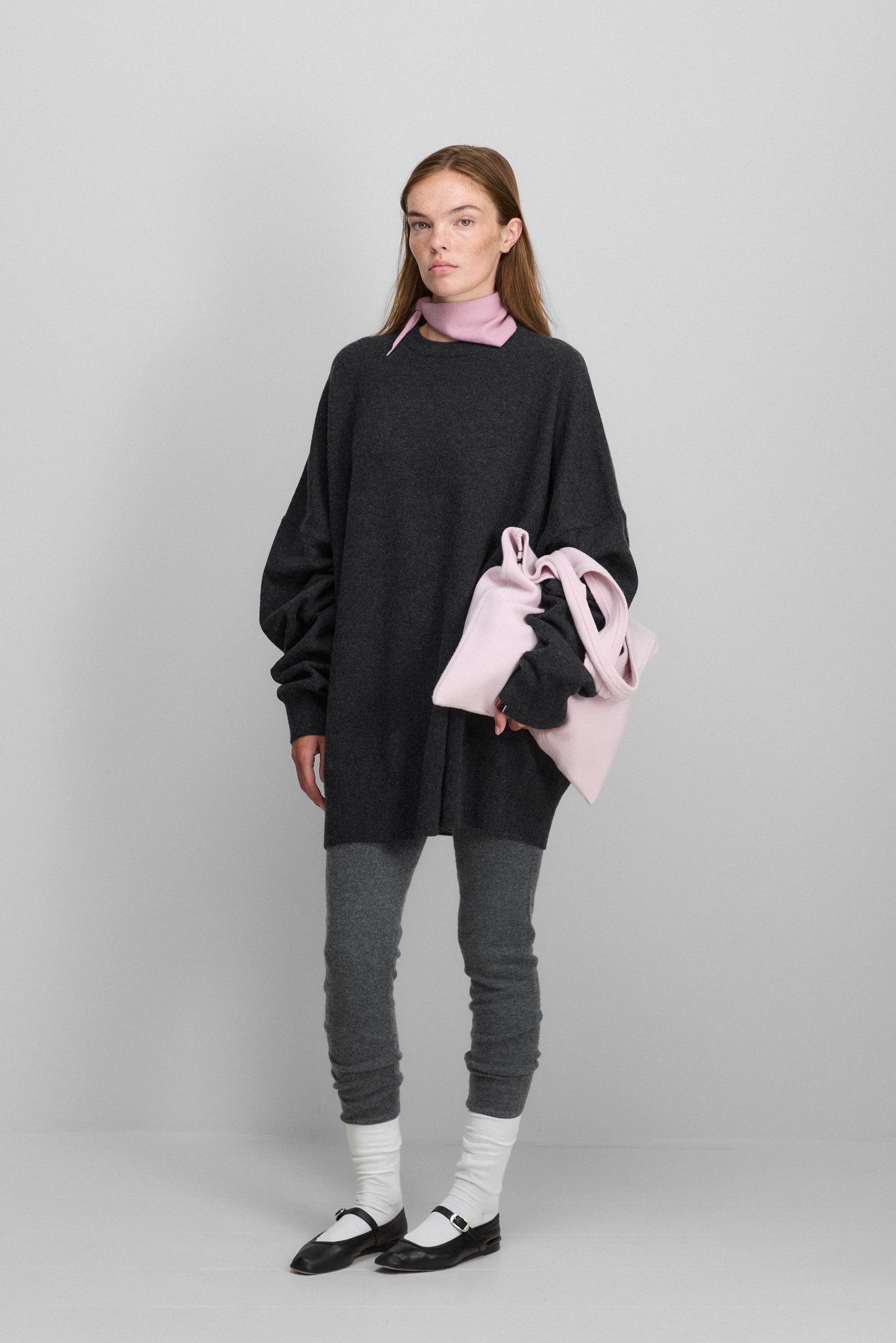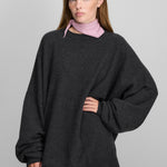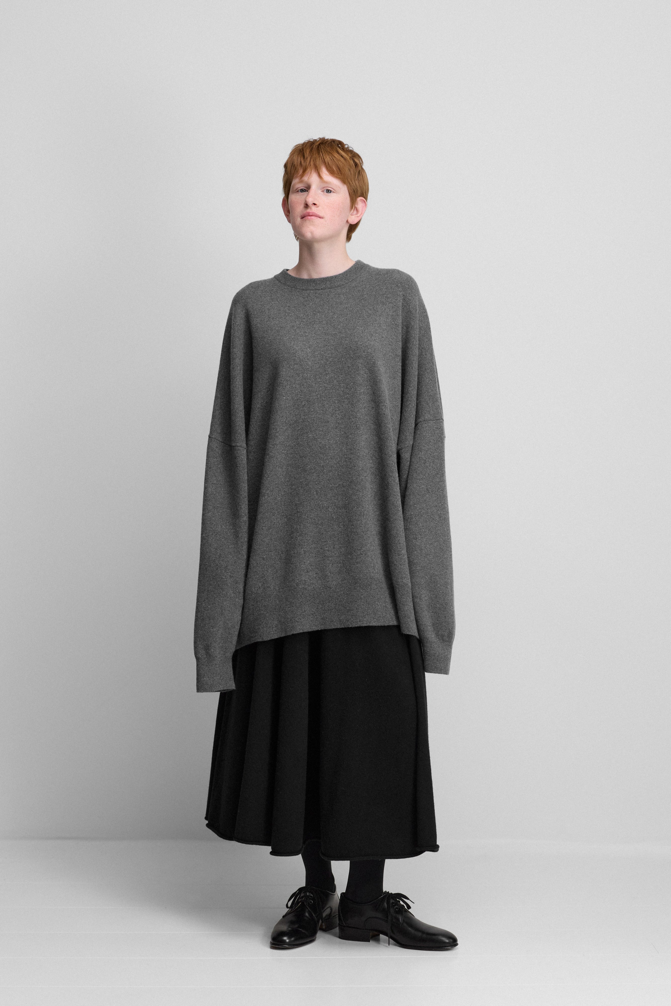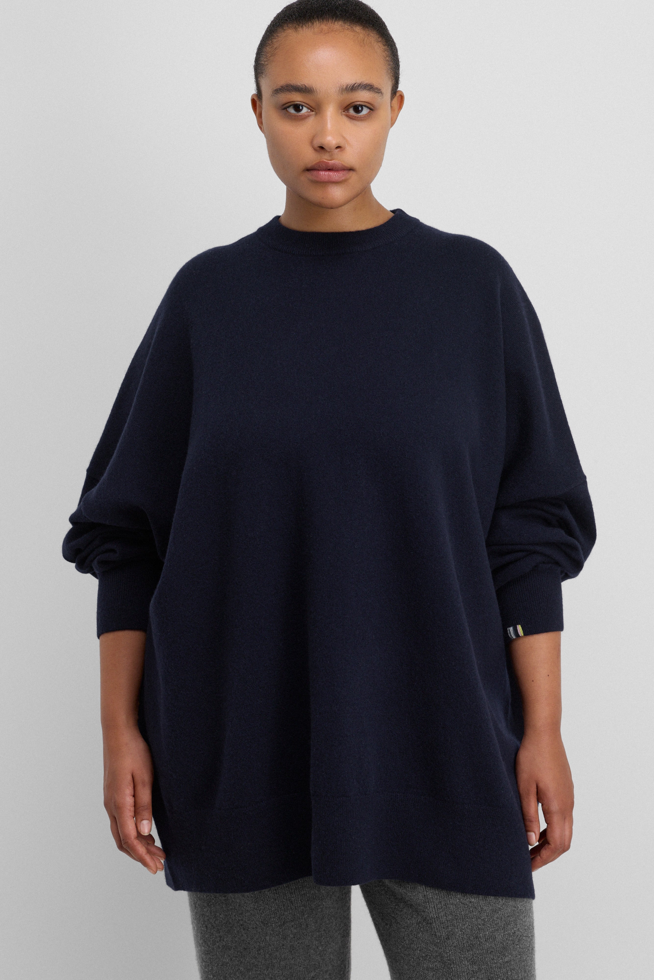 our favourite cashmere sweater juna truly looks different on every body. It’s an oversized crewneck cashmere sweater with extra long sleeves. this drop-shoulder jumper is rib-knitted at the neck, hem and cuffs.