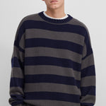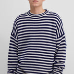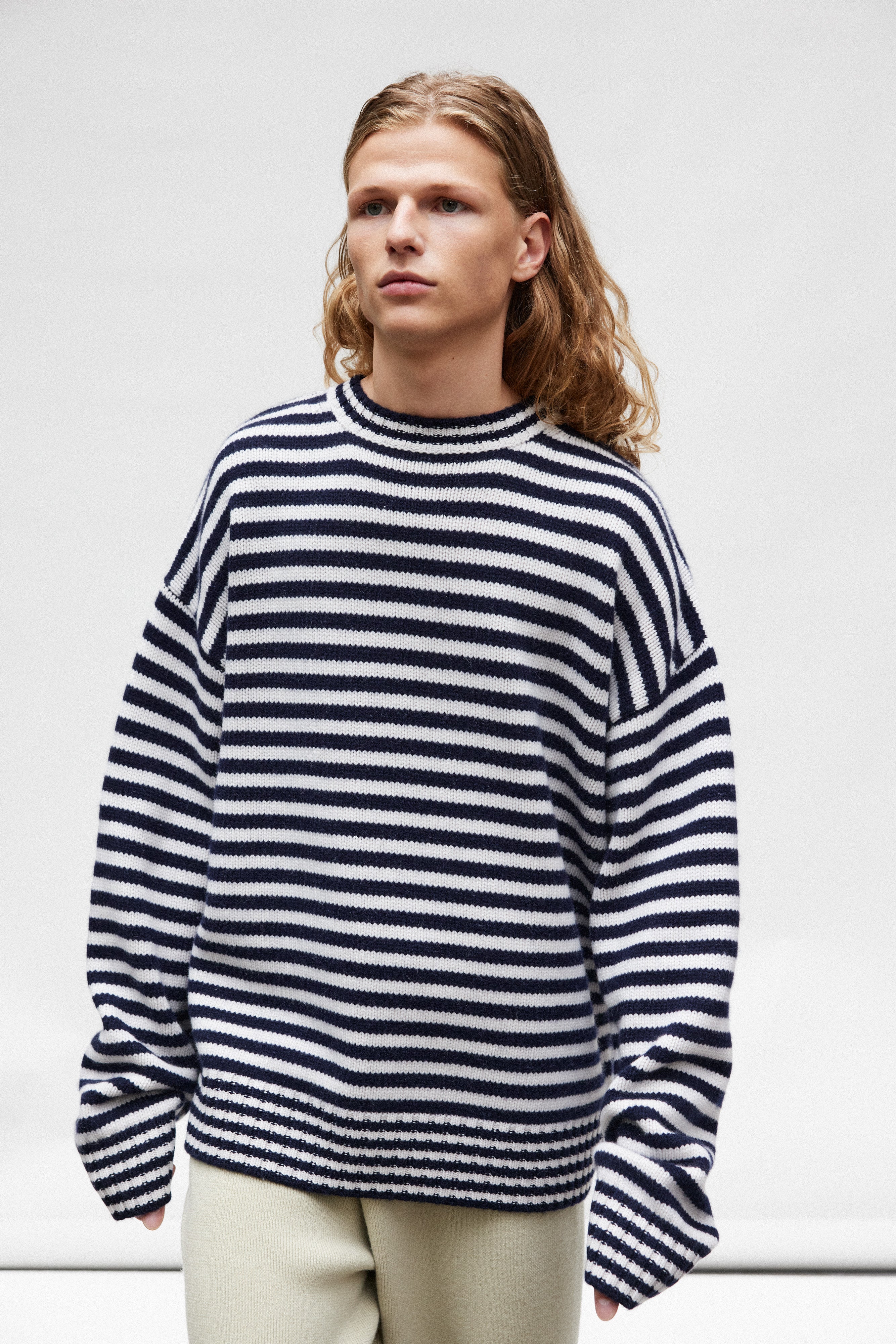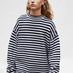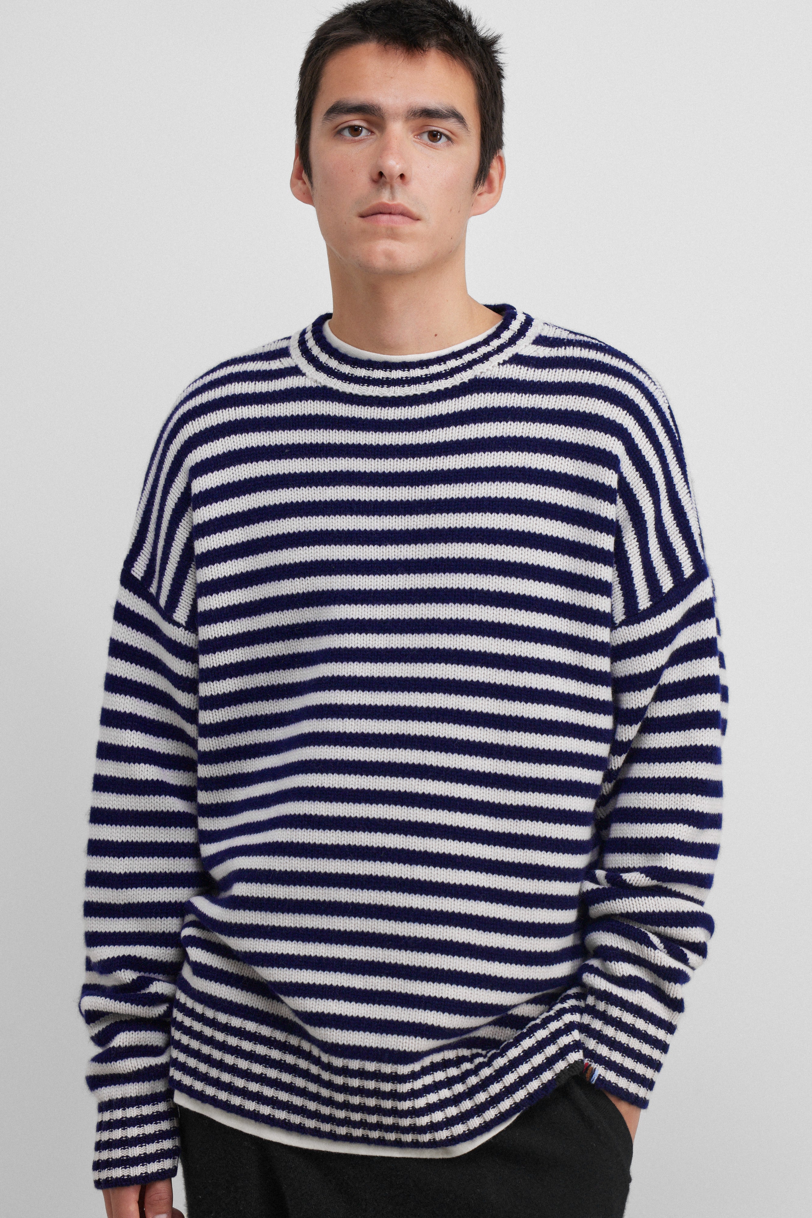 crafted in a luxurious heavy knit, cashmere crew-neck sweater lovely keeps you warm and cozy in the cold. this cashmere sweater has a round neckline and rib-knitted hem and cuffs. the lovely is an enlarged version of our oldie sweater, both longer and wider. available in three different stripe patterns: breton features stripes in navy and cream, road features mud and navy stripes, and scream features pepper and black stripes.