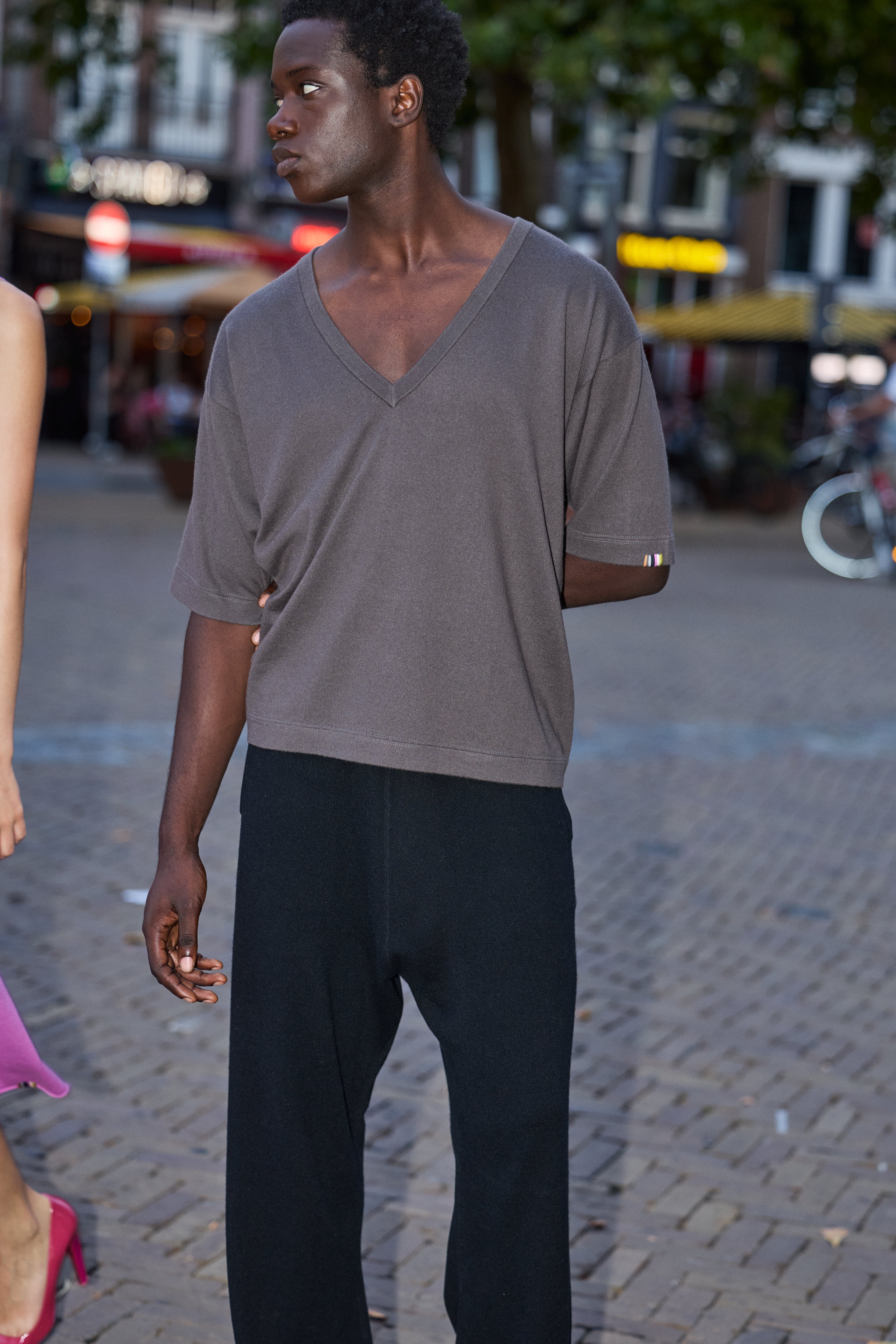 man wearing a loose-fit dark grey cotton cashmere t-shirt with a deep v-neck and elbow-length sleeves.
