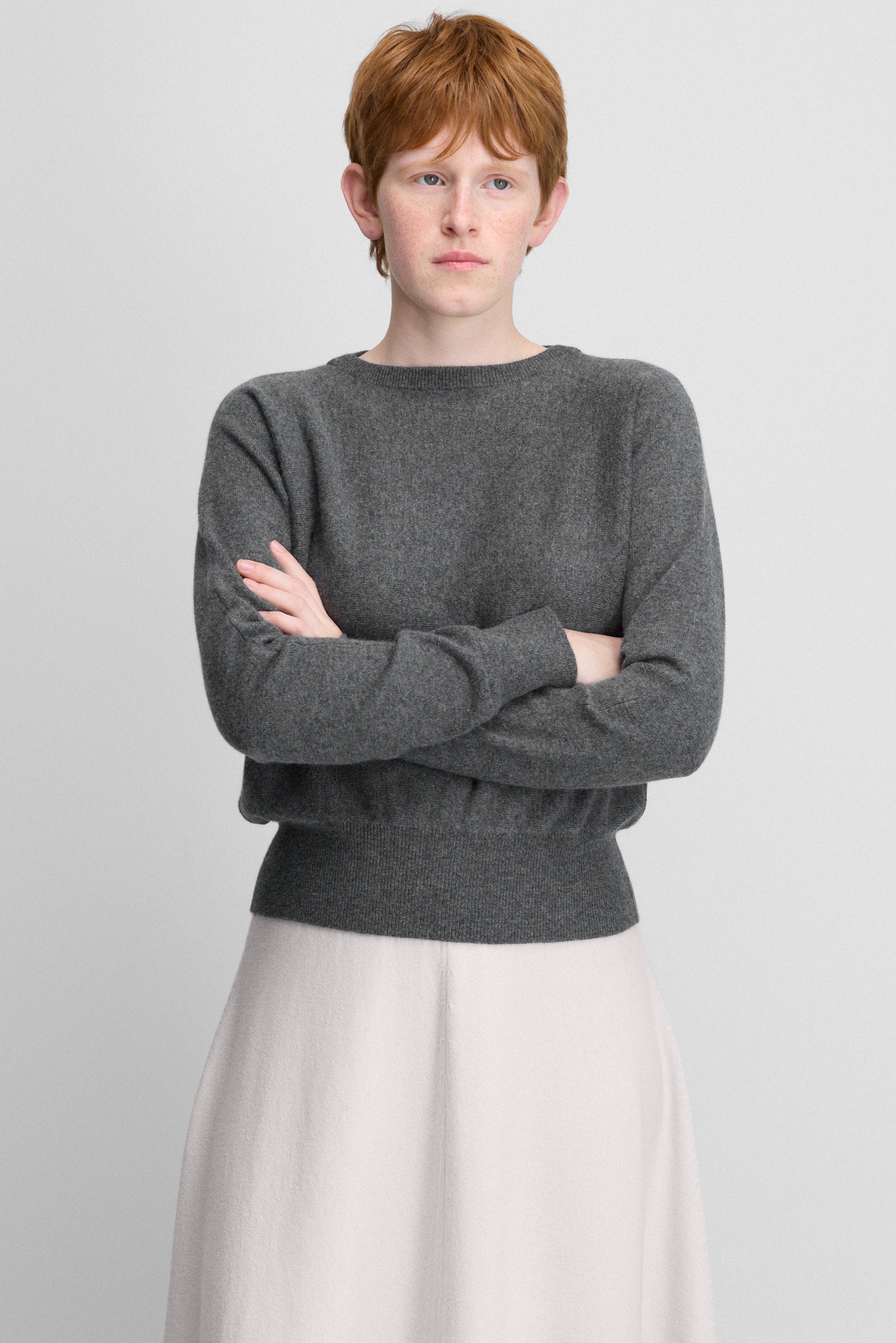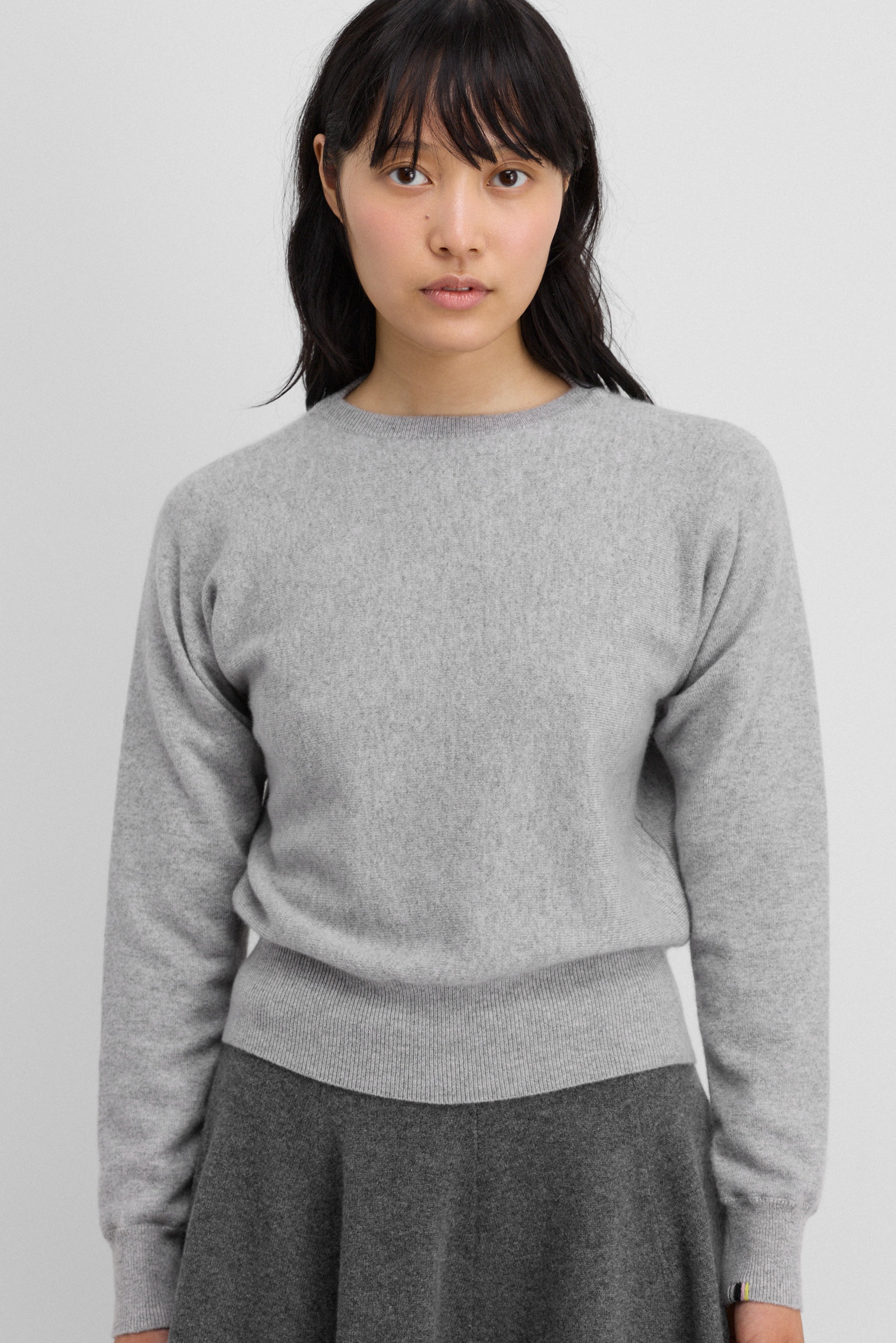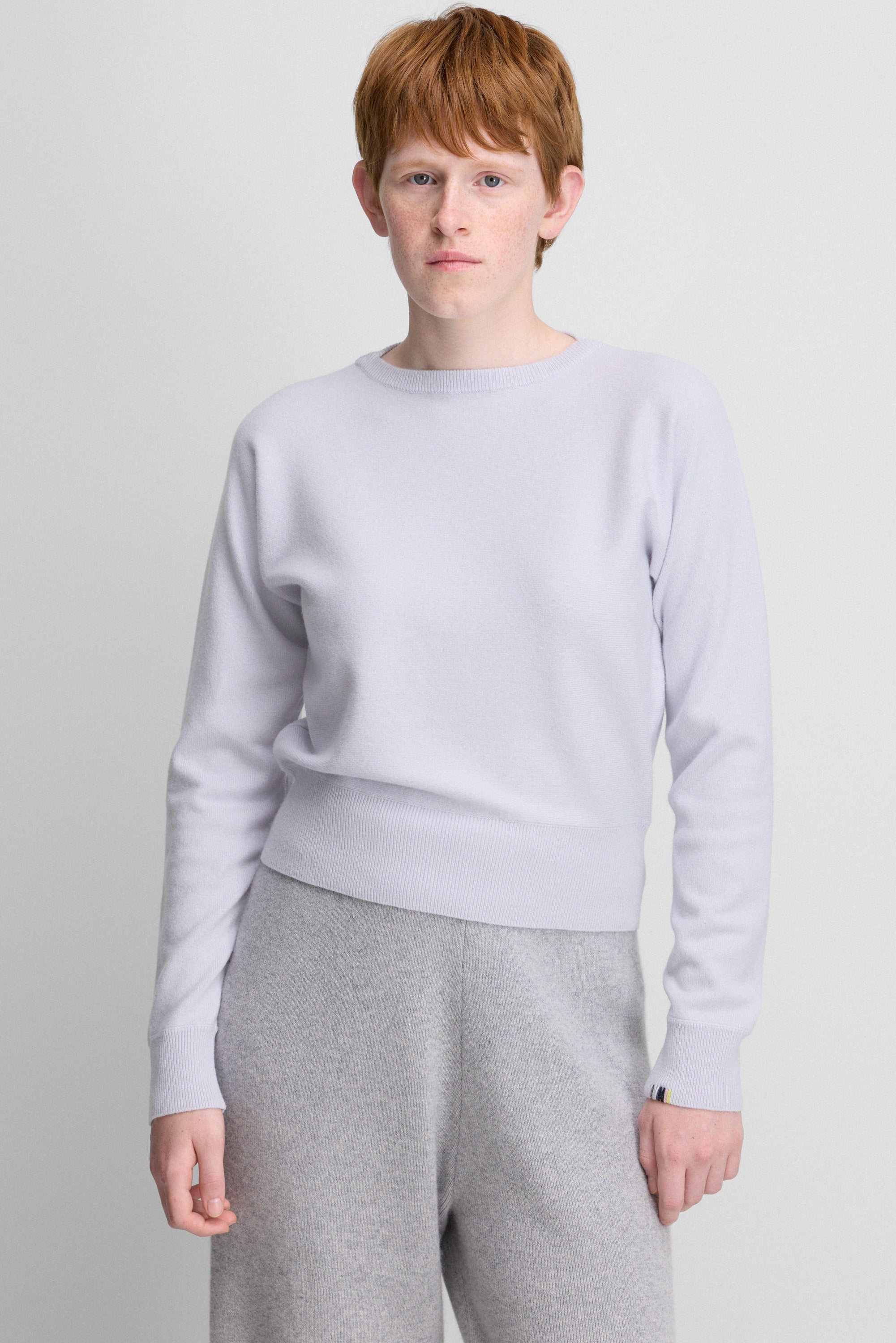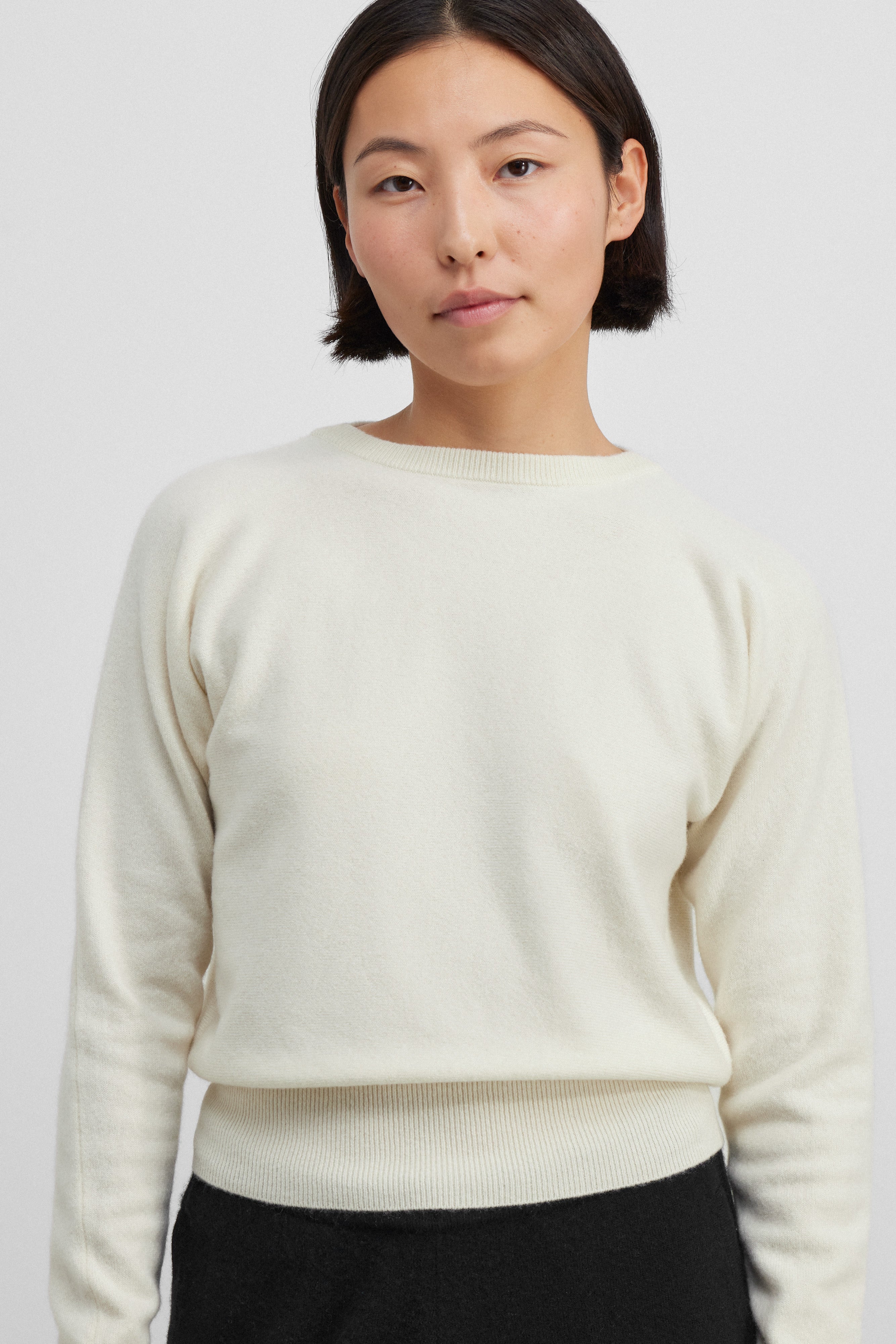 cropped cashmere sweater belle has a subtle bat sleeve. this small sweater is the same fit as our elleni top, but crafted in our regular luxurious cashmere knit.