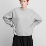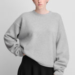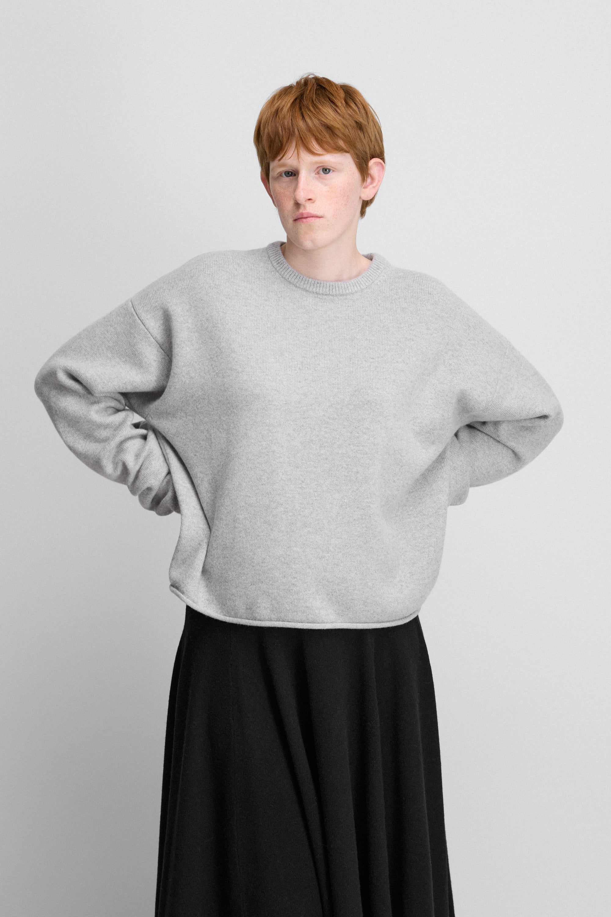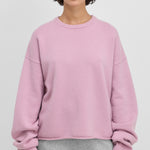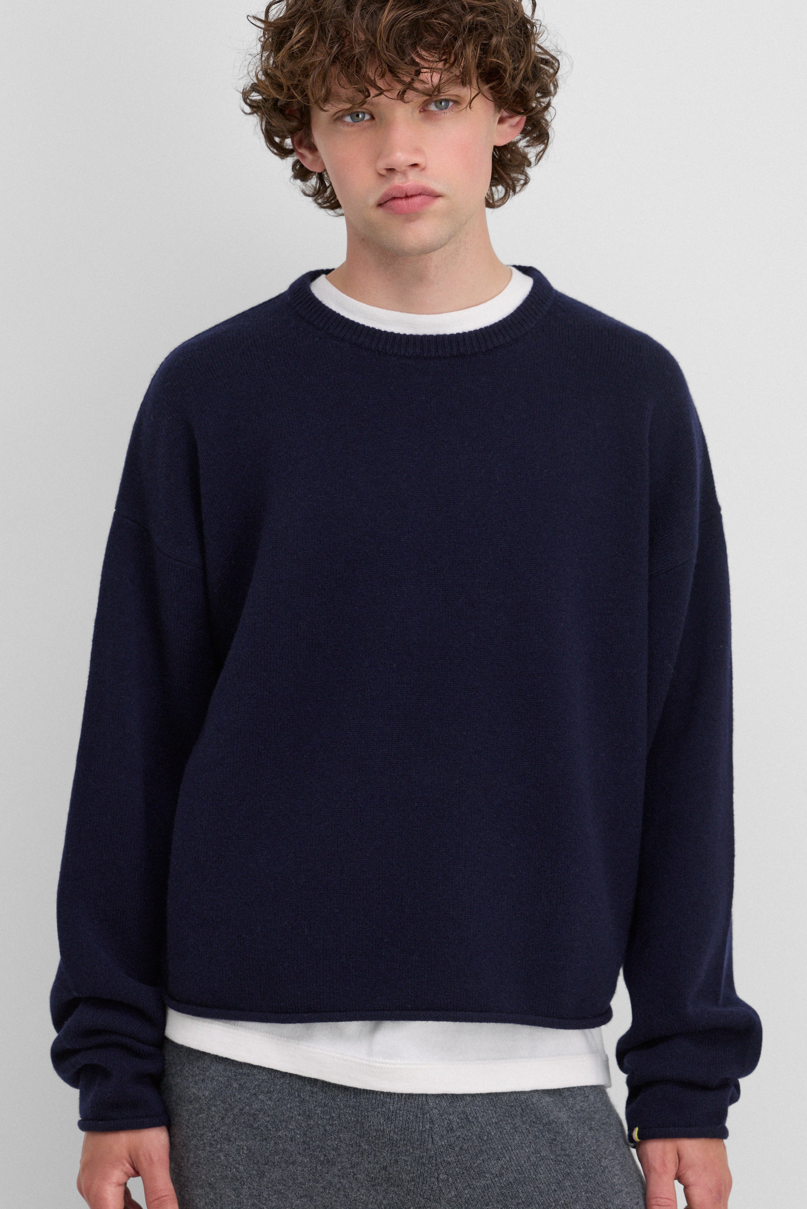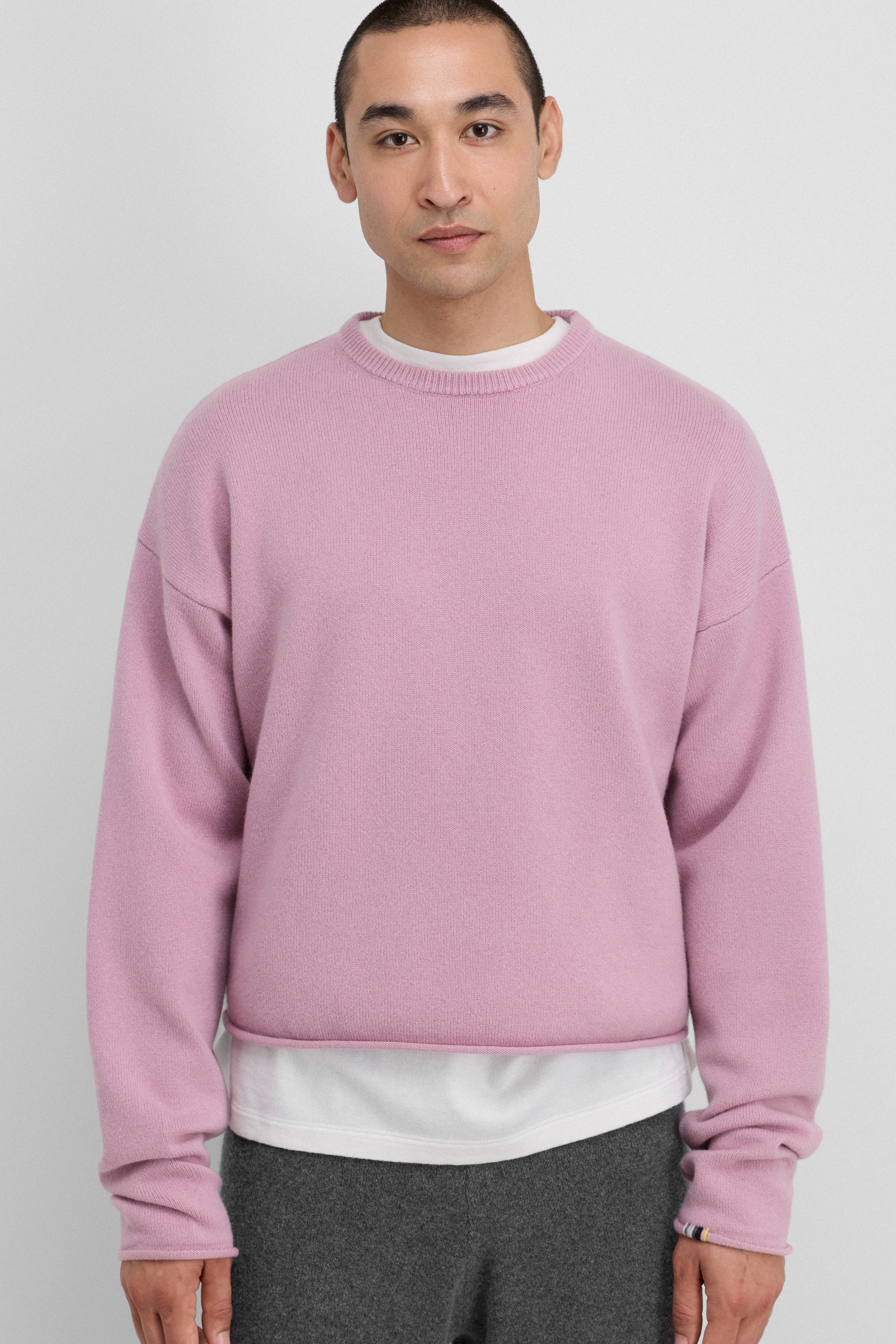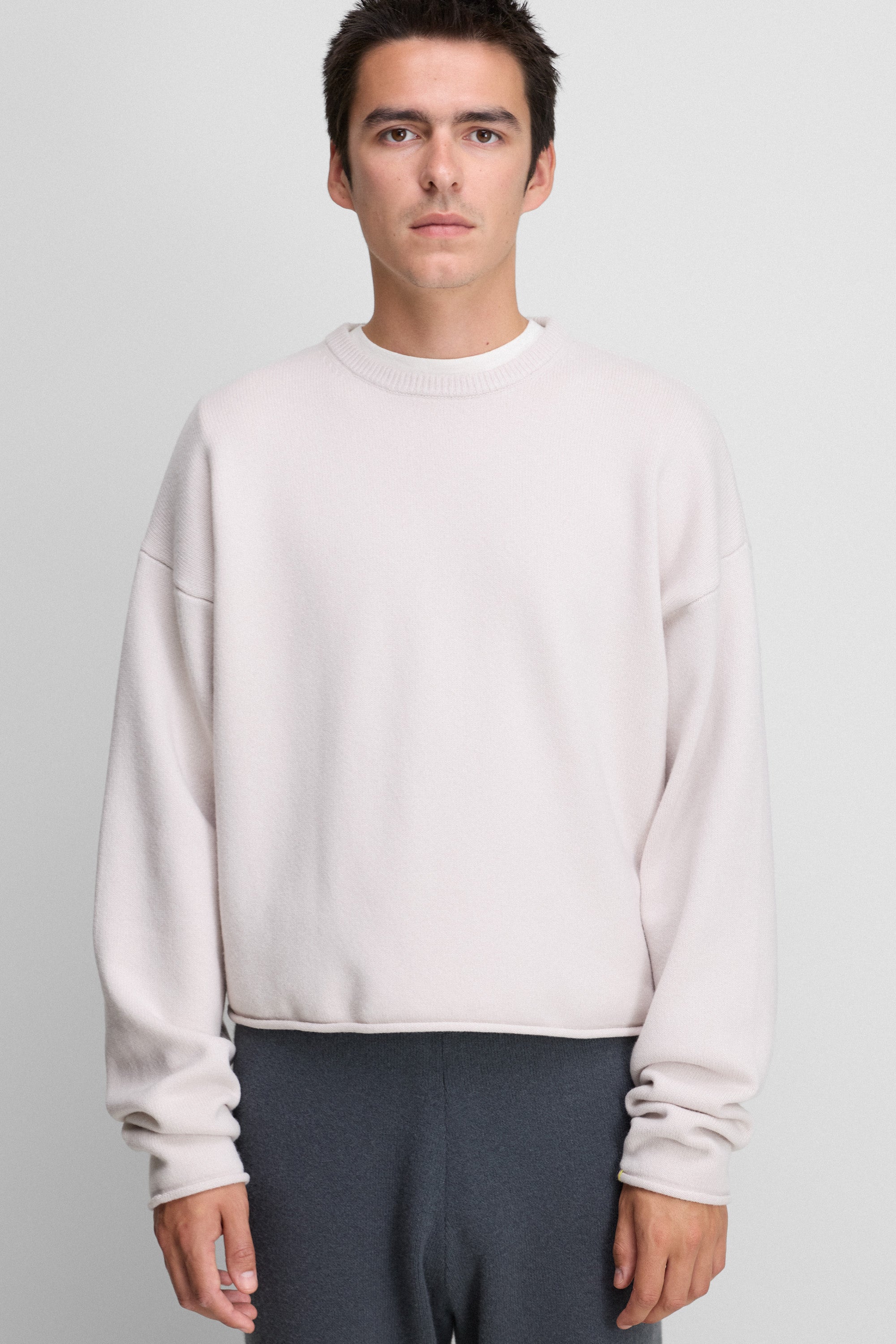 with a cropped, boxy silhouette, the comfy sweater elevates your everyday with the luxurious warmth of mid-weight cashmere. a ribbed crewneck, rolled-edge hem details and extra long sleeves complete this casual style.