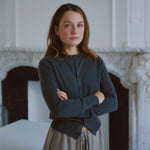woman wearing a dark grey cashmere crew-neck cardigan with eight corozo buttons and ribbed trims.