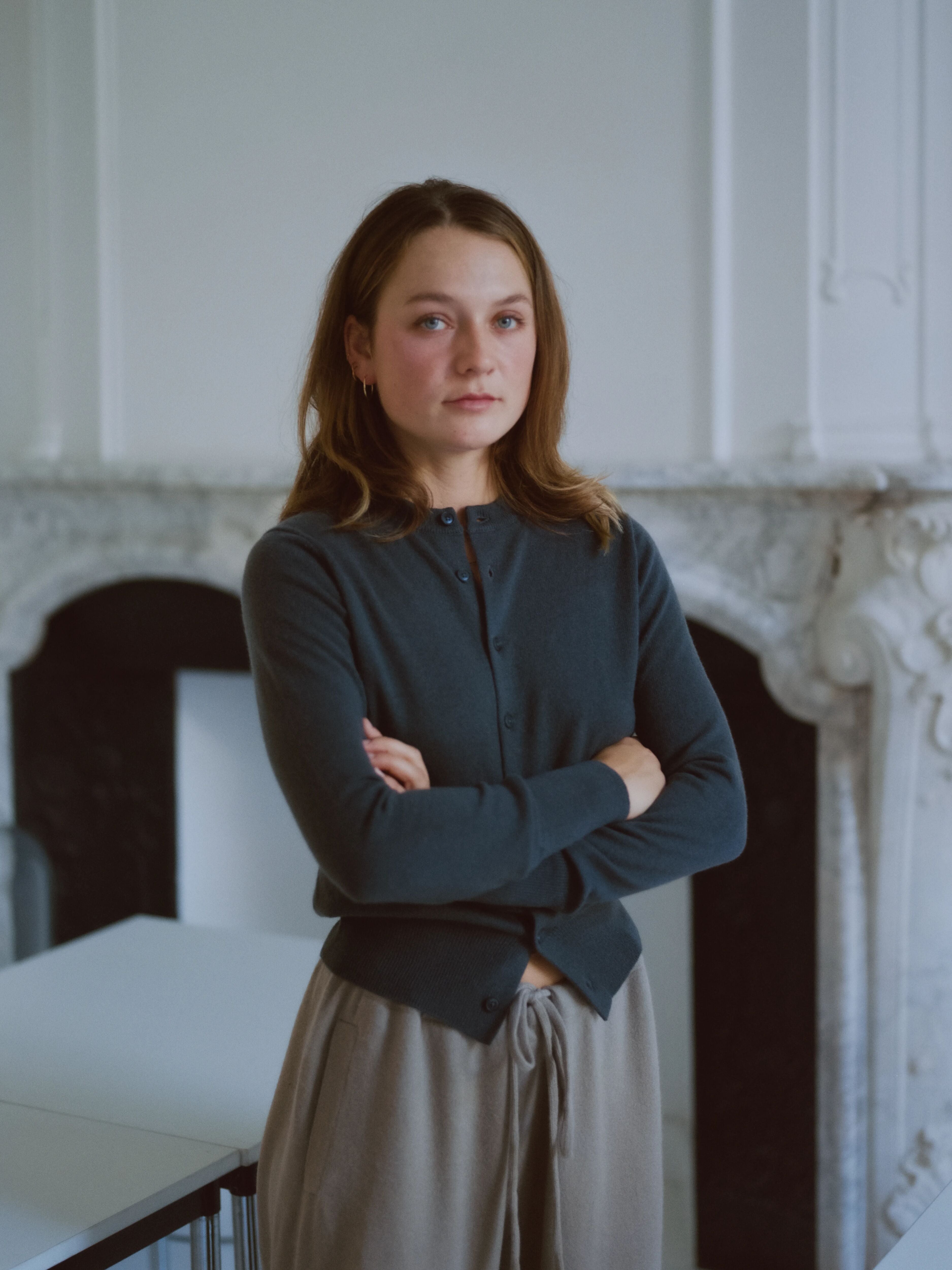 woman wearing a grey cashmere crew-neck cardigan with eight corozo buttons and ribbed trims.