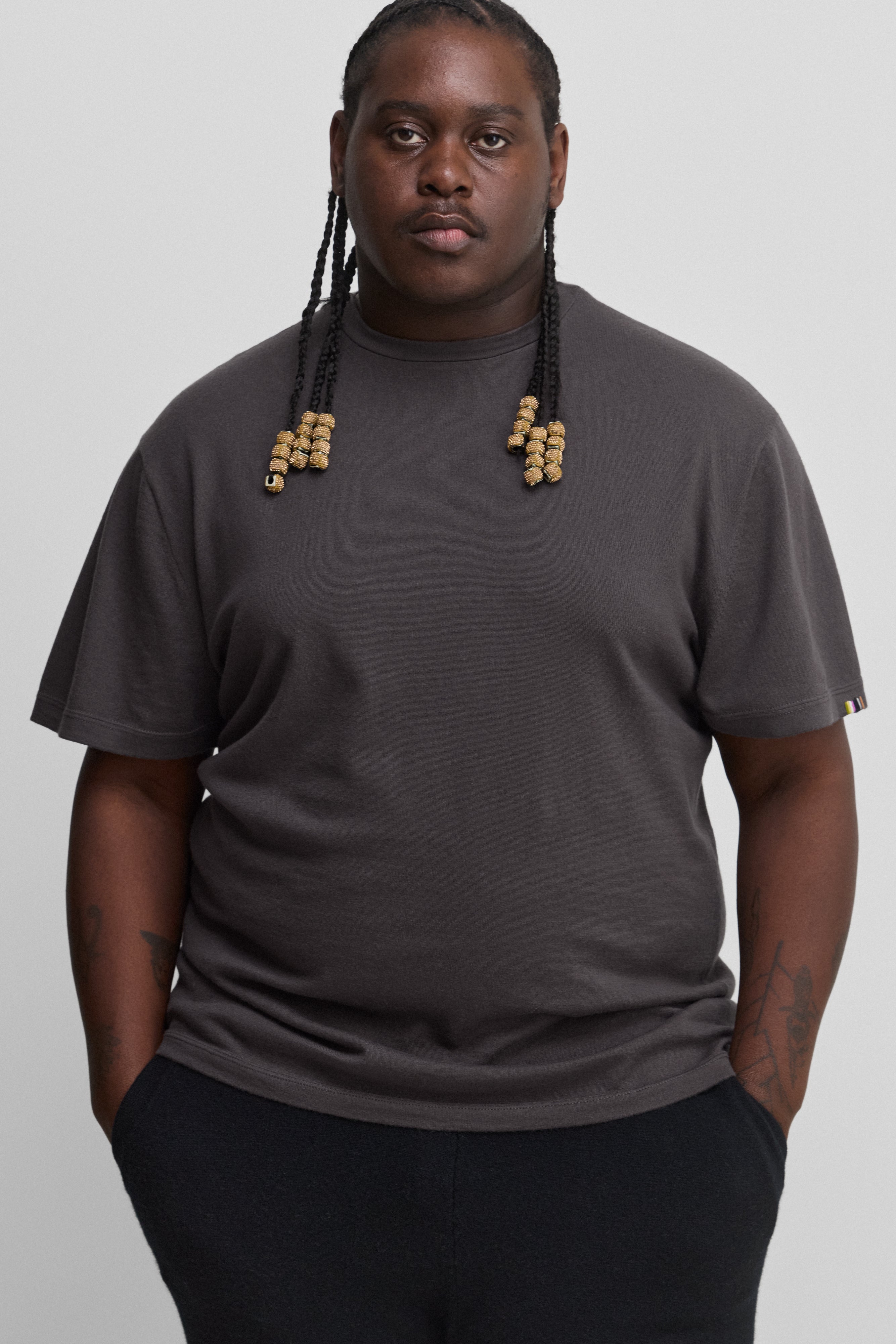 man wearing an oversized dark grey cotton cashmere t-shirt with a boat neck and elbow-length sleeves.