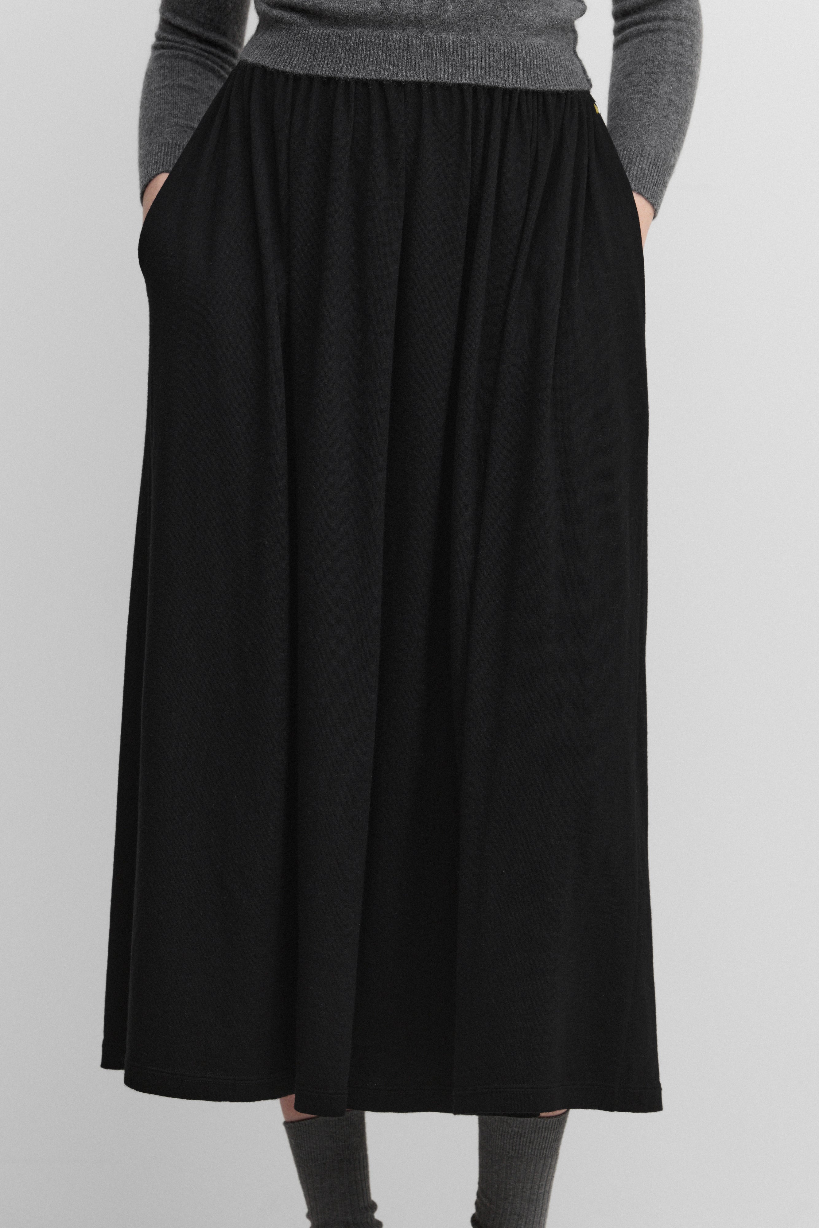 woman wearing a black cotton cashmere midi skirt with an elasticated waistband and two side pockets.