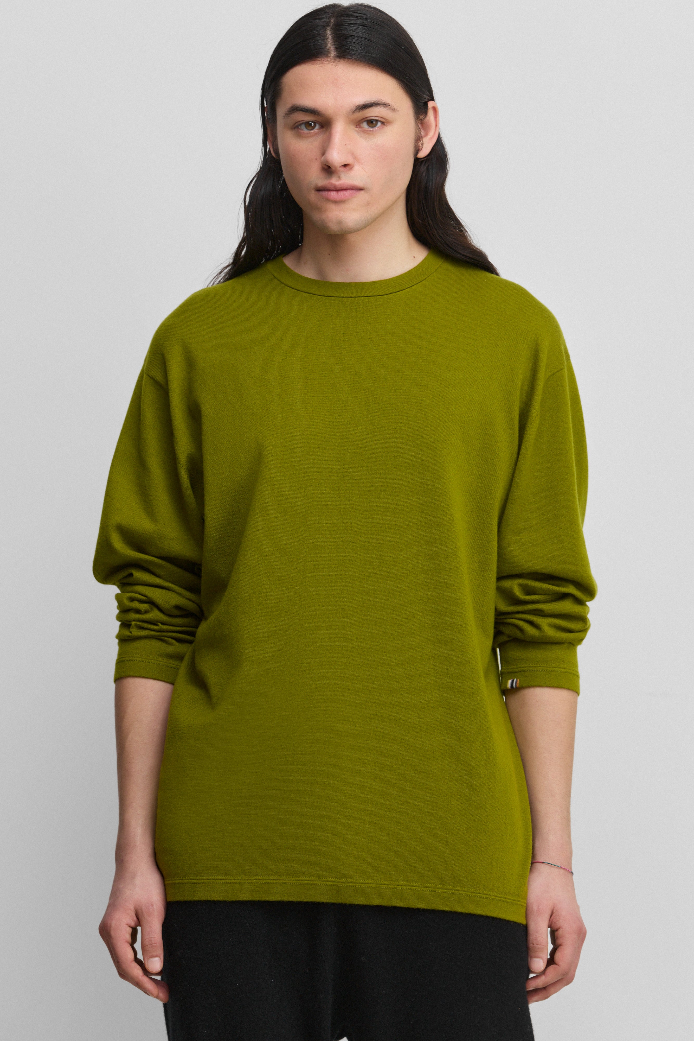 man wearing a dark grey relaxed-fit cotton-cashmere long-sleeved top with rolling-edge hem and cuffs