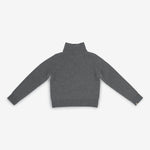 woman wearing a grey fitted heavy-knit cashmere turtleneck sweater with ribbed neck, hem, cuffs.