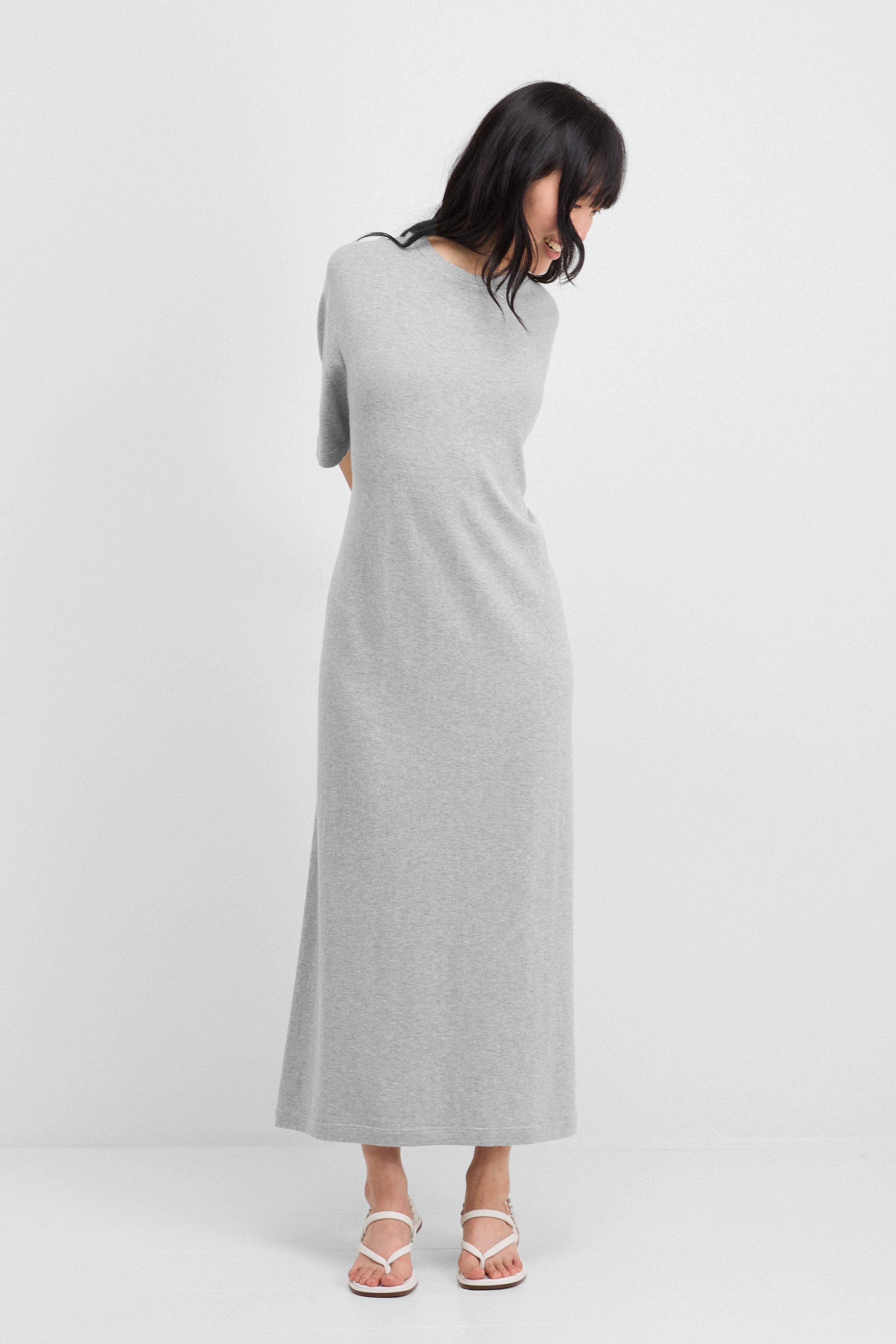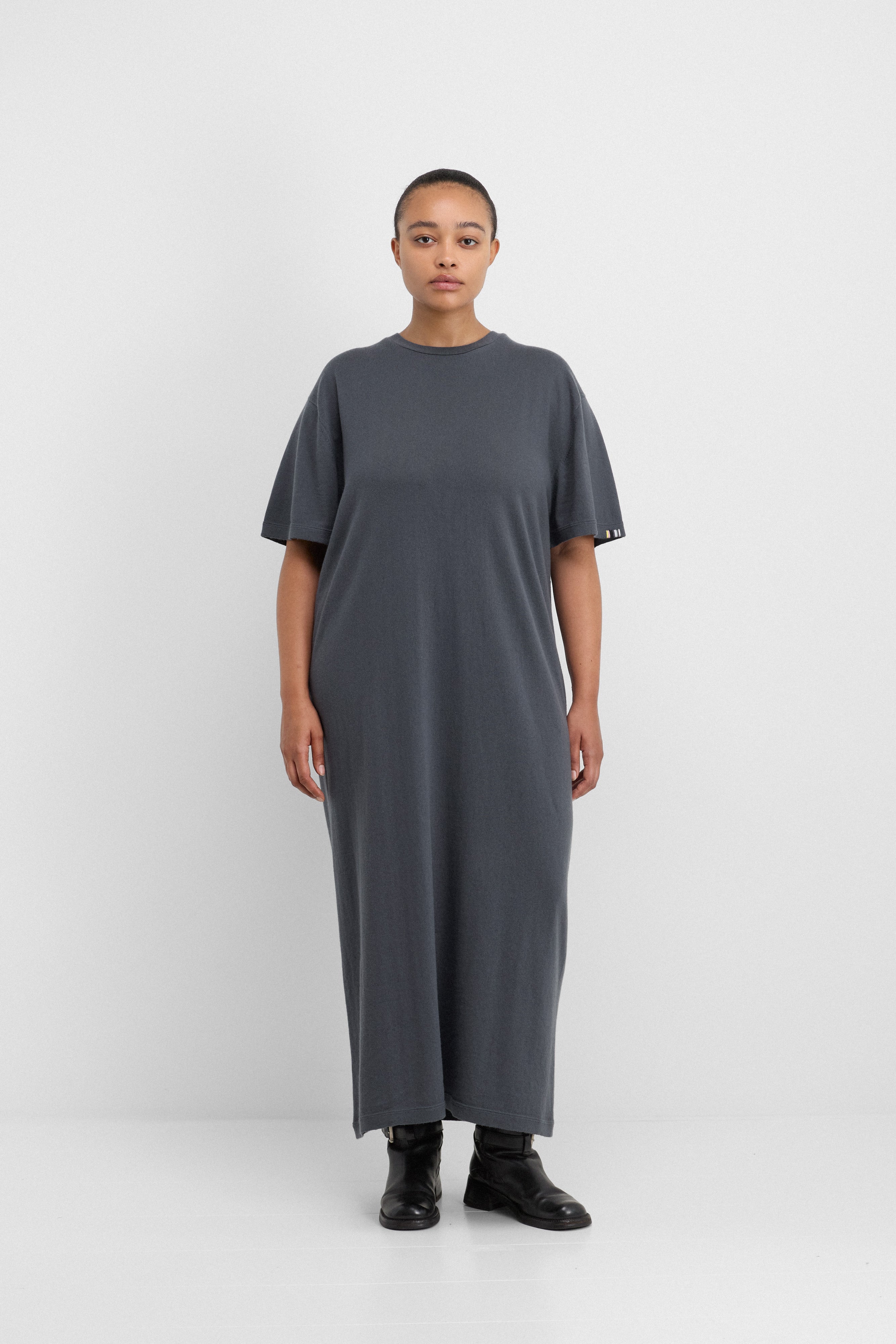 bequemes langes t-shirt-kleid mit kurzen ärmeln. das kris ist gerade geschnitten. es gehört zu unserer cotton-cashmere serie, die regulären kaschmir (30%) mit der klaren struktur und atmungsaktiven eigenschaft von baumwolle (70%) verbindet. je nach körpergröße reicht das kleid bis zu den knöcheln oder bis zum boden. wenn das kris short für sie zu kurz ist, wählen sie stattdessen das reguläre kris, das um 10 cm länger ist.