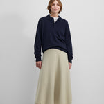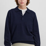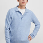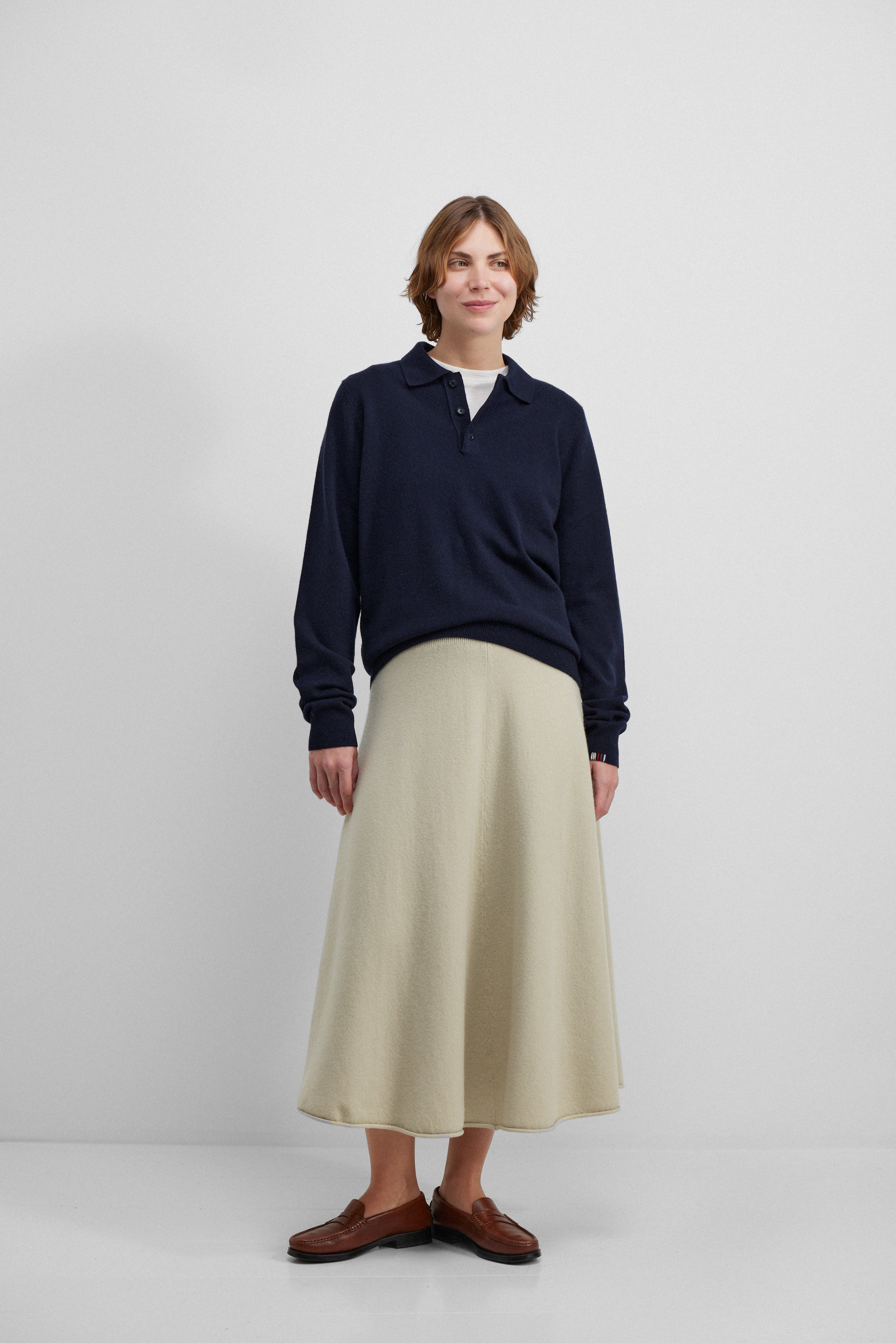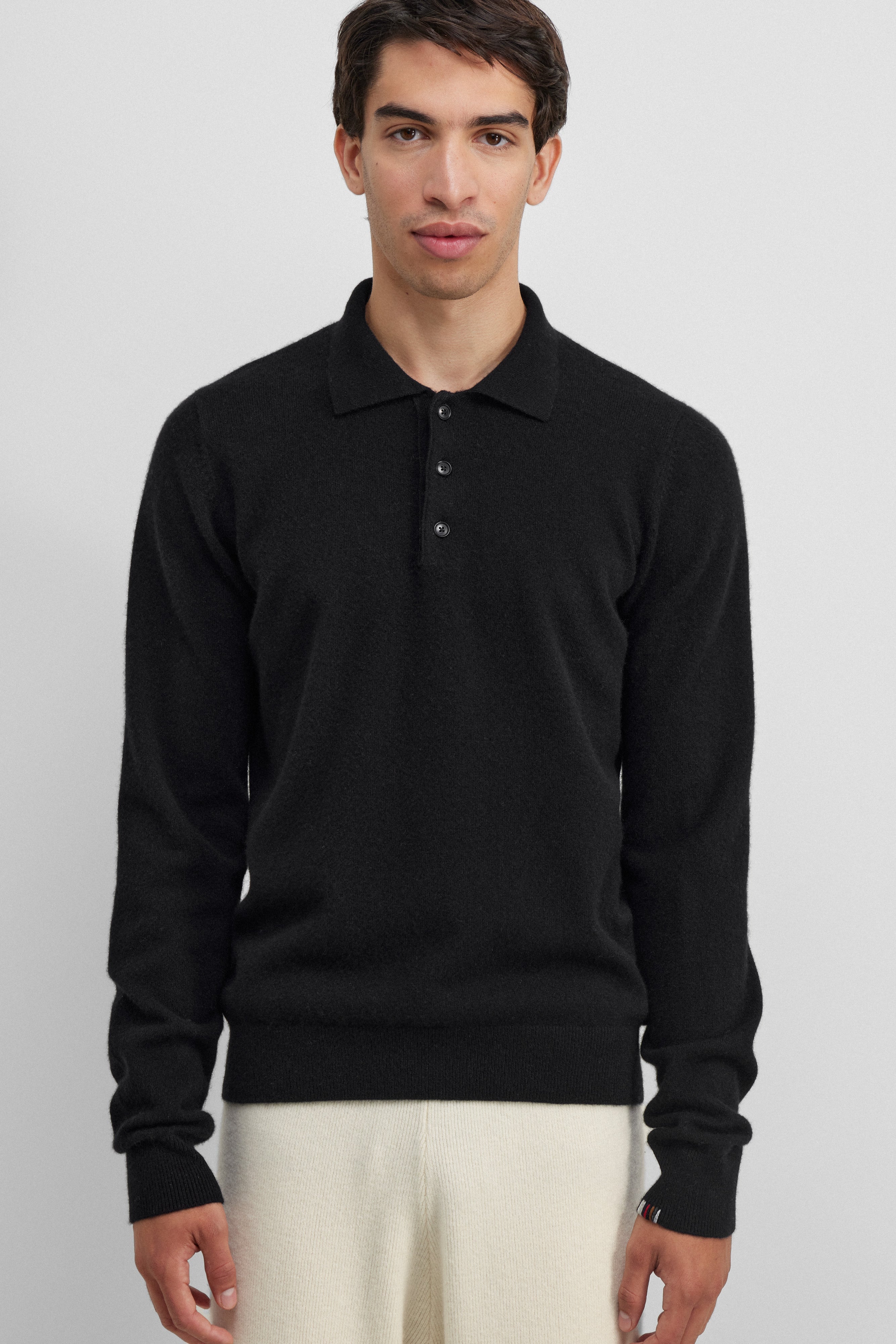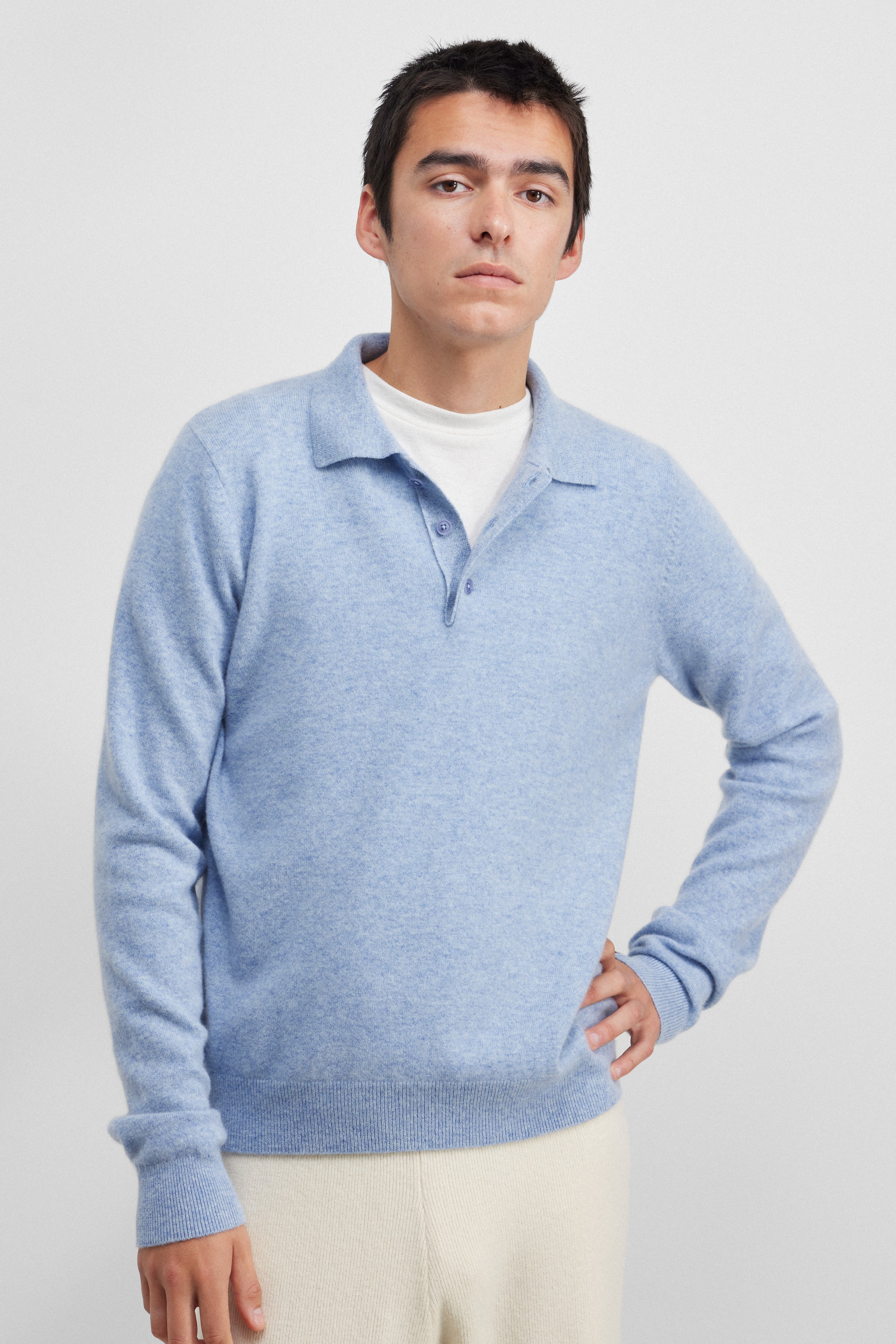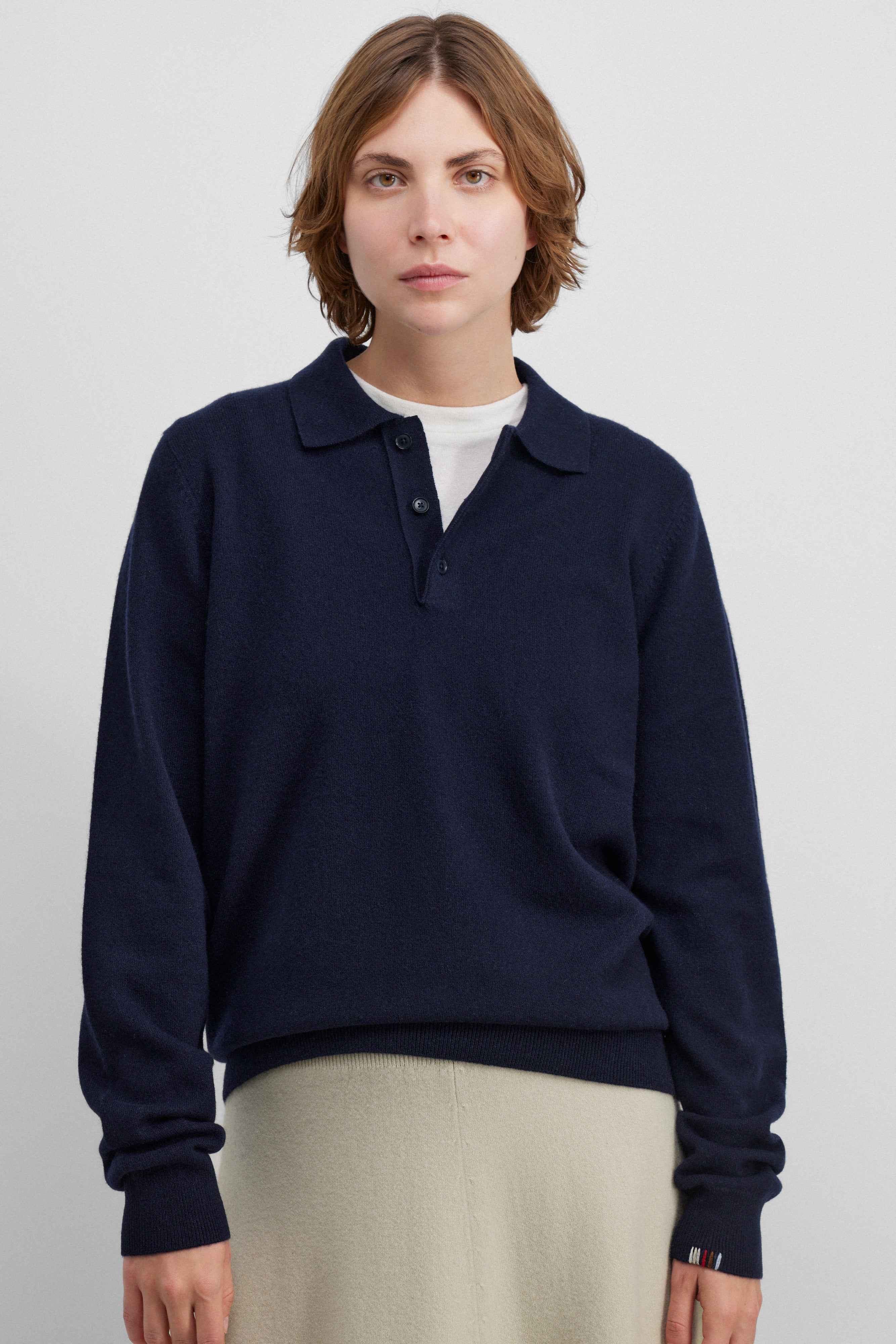 Neuerfundener klassischer kaschmir-pullover mit Polo-Kragen mit drei Knöpfen zum Schließen. Mit Rippstrick an Hals, Bündchen, Saum und mit langen Ärmeln. die knöpfe sind aus langlebigem corozo – ein vollkommen natürliches, chemikalienfreies material, das aus dem samen einer palme gewonnen wird.