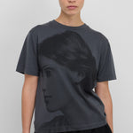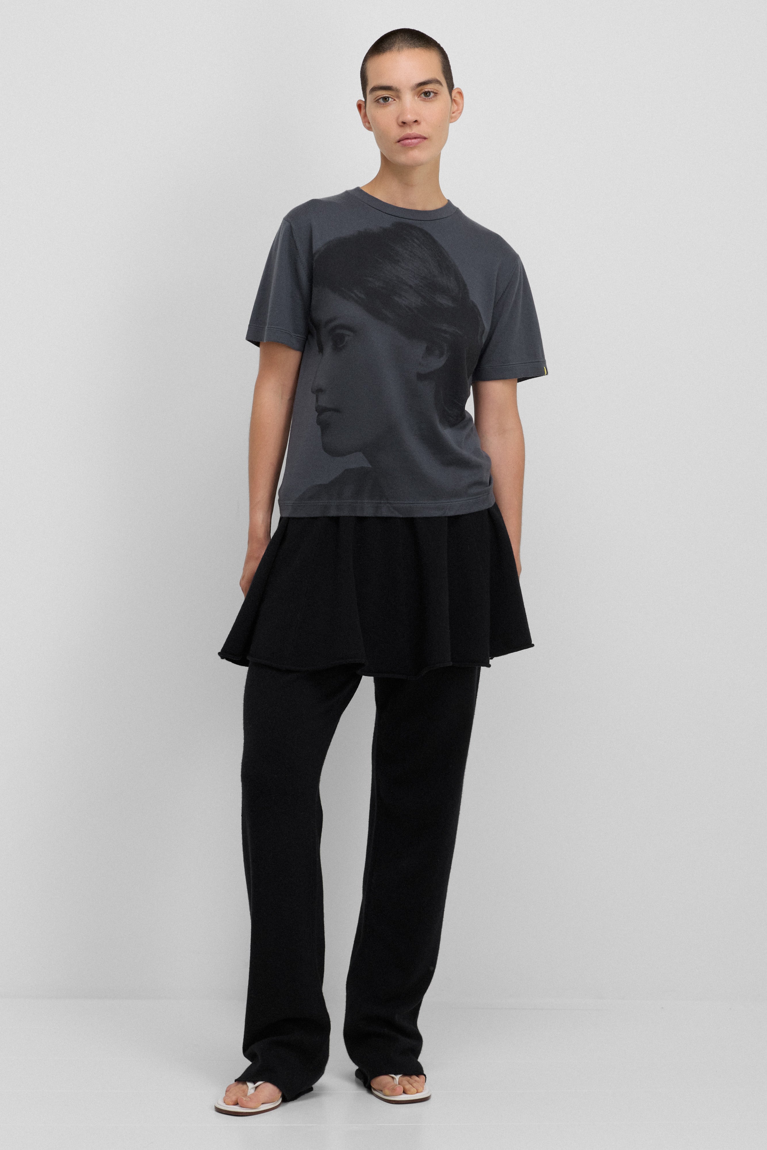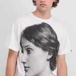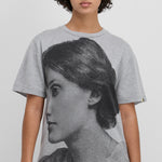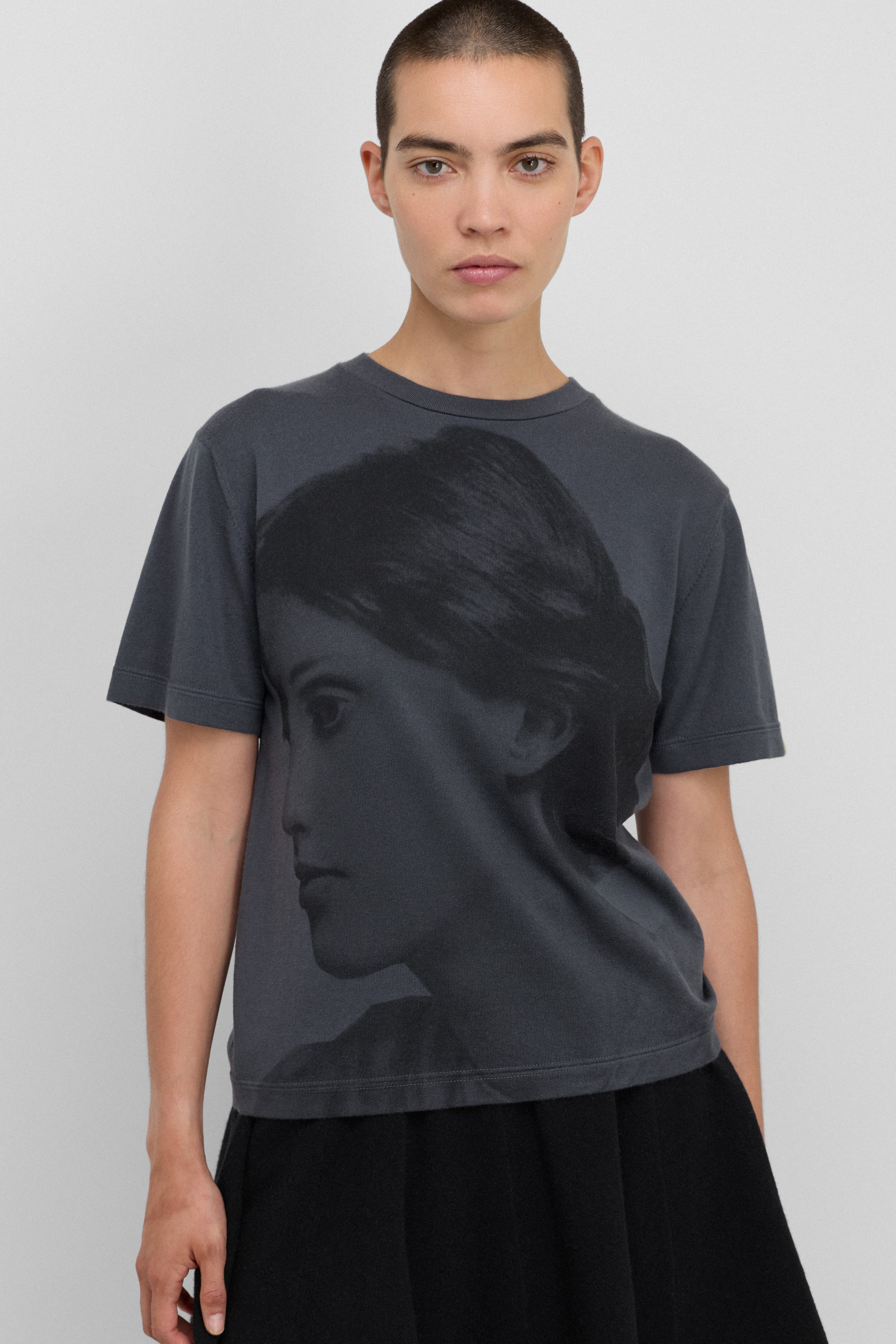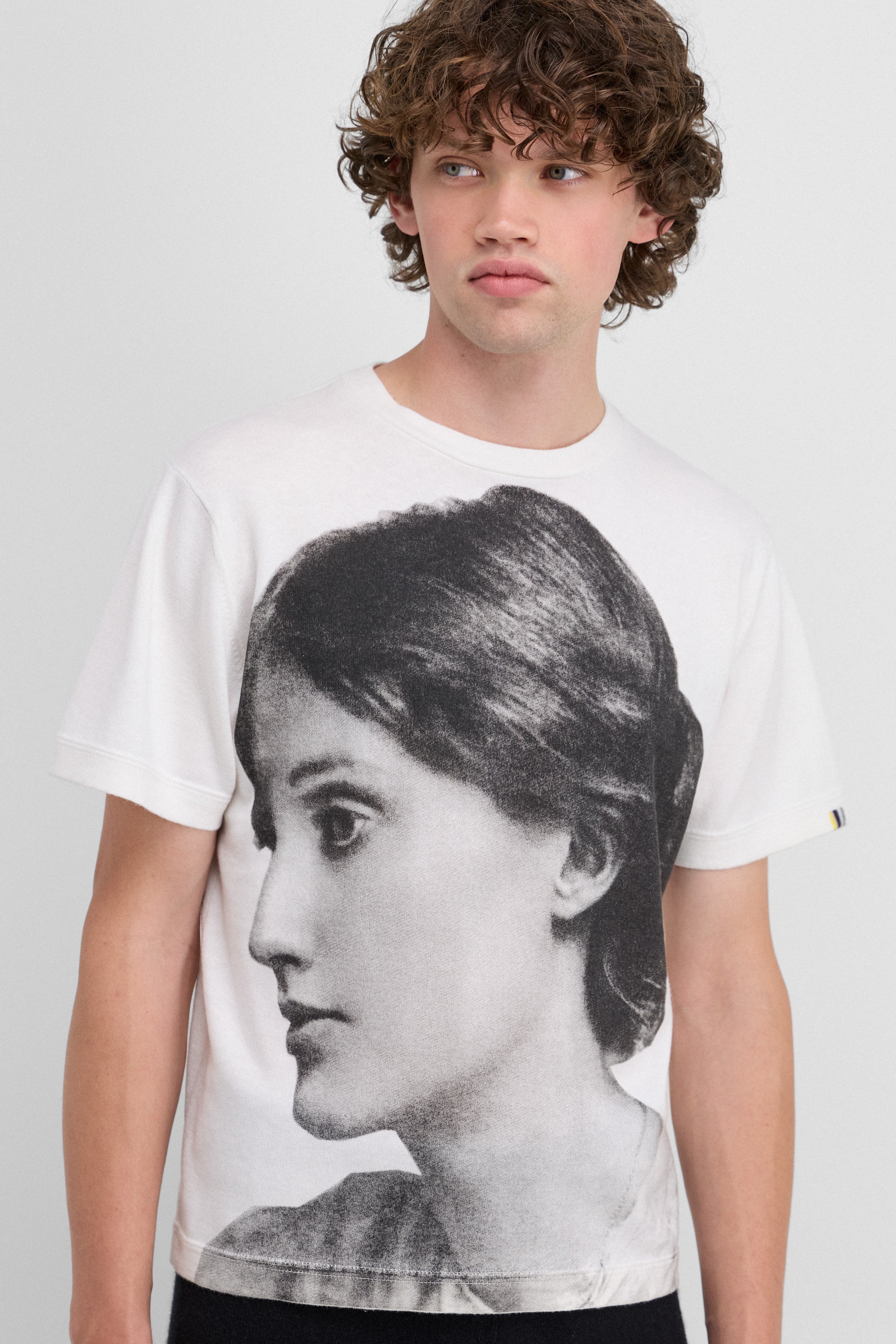 kurzärmliges t-shirt aus baumwoll-kaschmir-gemisch. unsere cotton-cashmere serie verbindet unser reguläres kaschmir (30%) mit der klaren struktur und atmungsaktiven eigenschaft von baumwolle (70%). angenehm bei wärme oder als extra lage im winter. dieses limitierte design zeigt einen schwarz-weißen siebdruck eines porträts der schriftstellerin virginia woolf. auch erhältlich als das größere rik t-shirt.