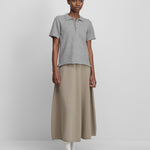 the ease is a flared cashmere midi skirt with a comfortable rib-knitted waistline and a rolling edge hem. crafted from high-quality cashmere, this skirt is warm and voluminous, perfect for any occasion.
